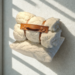 Alça de Couro Genuíno (Removível): A manta vem com uma sofisticada alça de couro genuíno em tom caramelo, que serve para prendê-la quando enrolada, transformando-a em um item de design elegante para prateleiras ou para levar em viagens. A alça é removível para uso diário da manta.