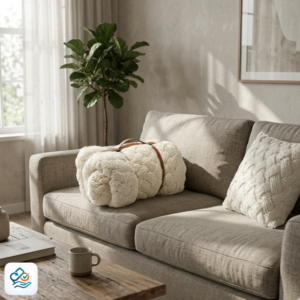 Conjunto Cozy Tricot Off-White: Manta com Alça de Couro + Almofada – O Toque de Conforto que sua Casa Merece!