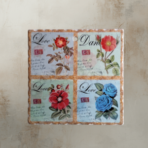 • Design Quadripartido: A peça é dividida em quatro quadrantes, cada um apresentando uma espécie de rosa em cores vibrantes (vermelho, rosa, salmão e azul) sobre um fundo com caligrafia clássica e selos vintage.