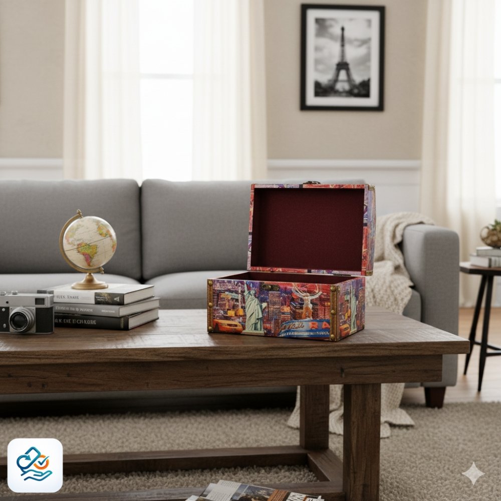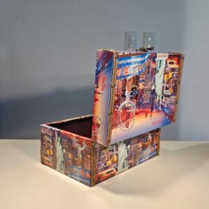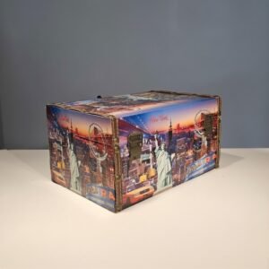 Dê um toque cosmopolita e retrô à sua casa com este charmoso baú decorativo. Com uma estampa vibrante que celebra os ícones de Nova Iorque e outras grandes metrópoles, esta peça une a nostalgia das viagens clássicas com a praticidade da organização moderna.