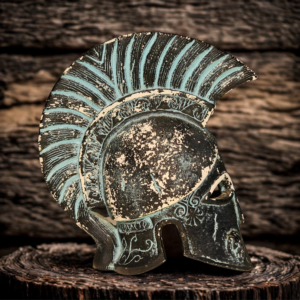 ​O acabamento envelhecido, com pátina turquesa (azinhavre), confere a este capacete uma aparência autêntica, como se tivesse sido recuperado de uma escavação arqueológica. O contraste entre o metal escurecido e o verde-azulado realça cada detalhe de seu design icônico, tornando-o um ponto focal em qualquer estante ou escrivaninha.