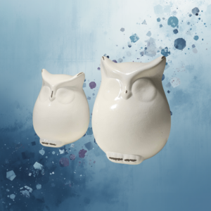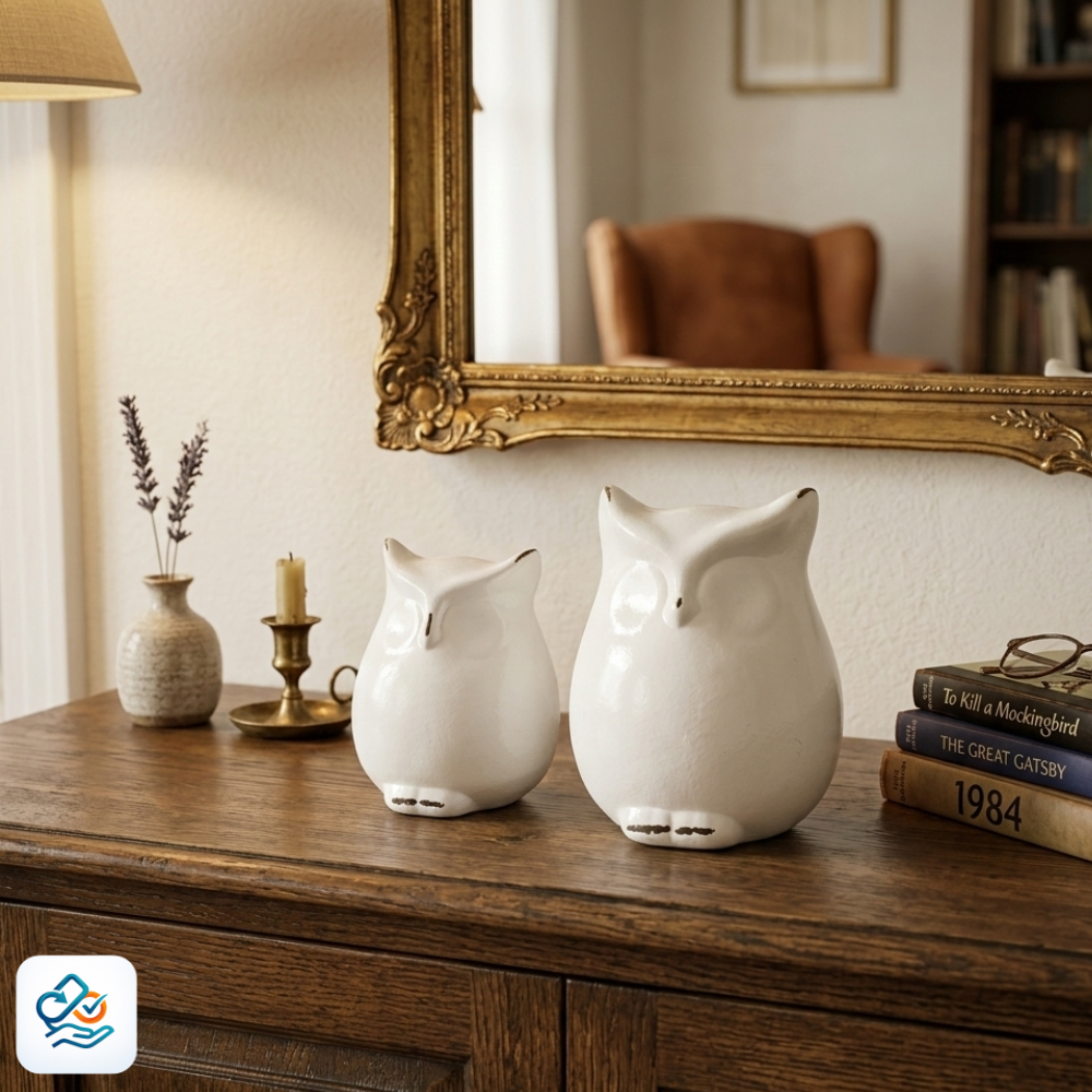 Adicione um toque de charme e serenidade ao seu lar com este par exclusivo de corujas decorativas. Feitas de cerâmica de alta qualidade com um acabamento branco brilhante e suave, estas peças são perfeitas para prateleiras, consoles, mesas de cabeceira ou aparadores (como visto nas fotos).