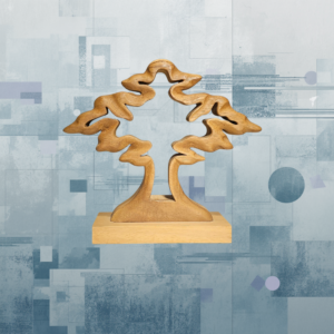 A peça apresenta um trabalho de entalhe primoroso, onde o tronco se ramifica em curvas sinuosas que criam um jogo de luz e sombra único. A base em tom de madeira clara oferece o suporte ideal, garantindo estabilidade e elegância.