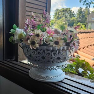 Fruteira/Porta-Flores de Metal Rendado com Arranjo Floral – Charme e Elegância Vintage