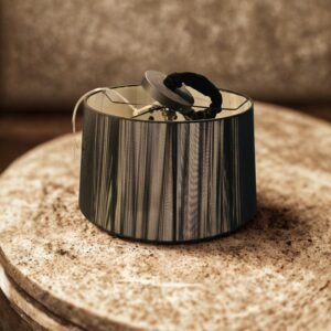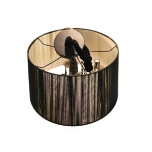 O abajur de tecido preto translúcido, com textura sutil e detalhes prateados, cria um visual moderno e refinado.