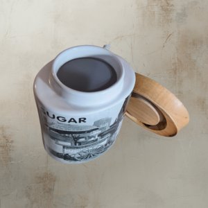 ​Adicione um toque de nostalgia e estilo industrial ao seu cantinho do café com esta peça única. Este pote de açúcar combina a elegância da cerâmica com a rusticidade da madeira, sendo um item indispensável para quem aprecia decoração com história.